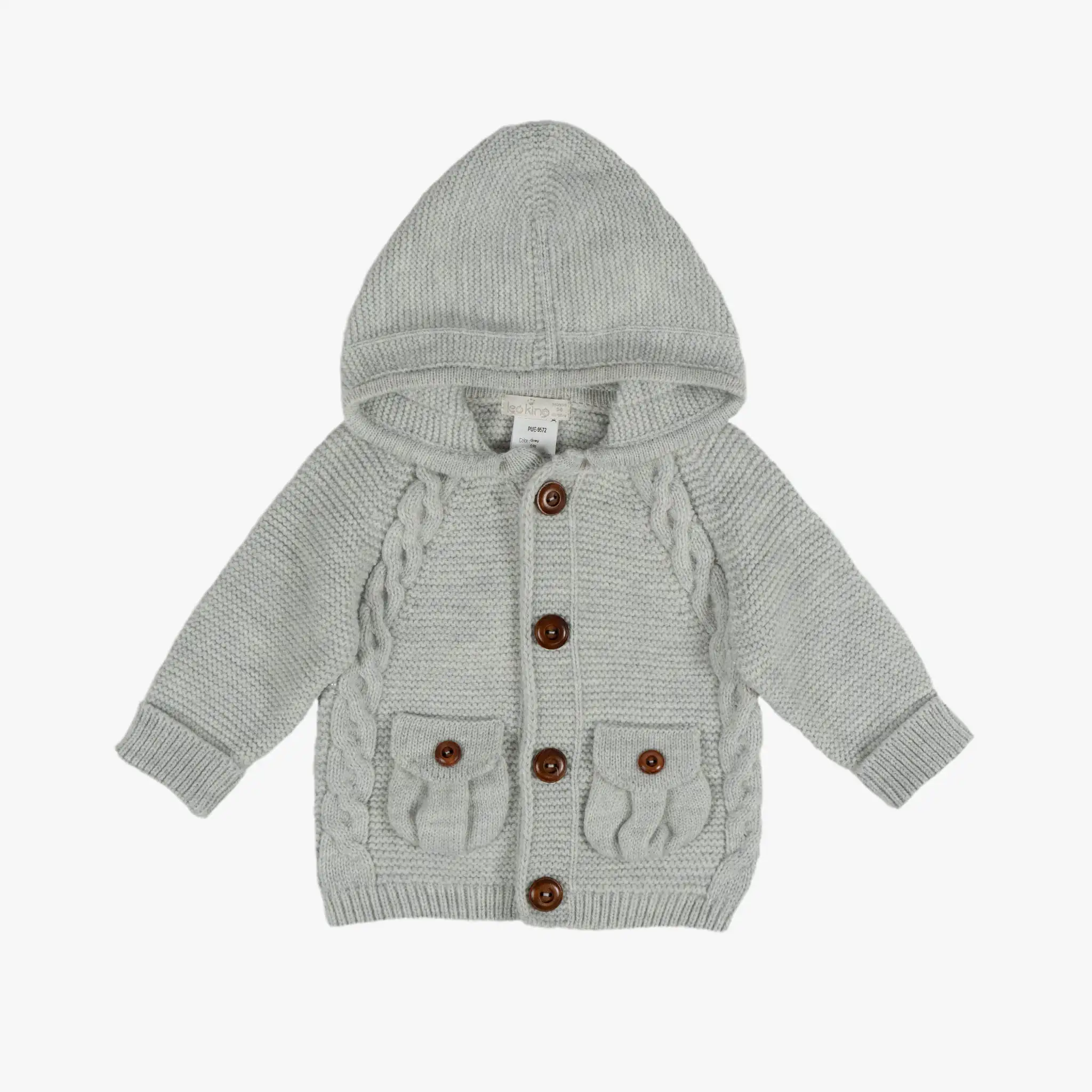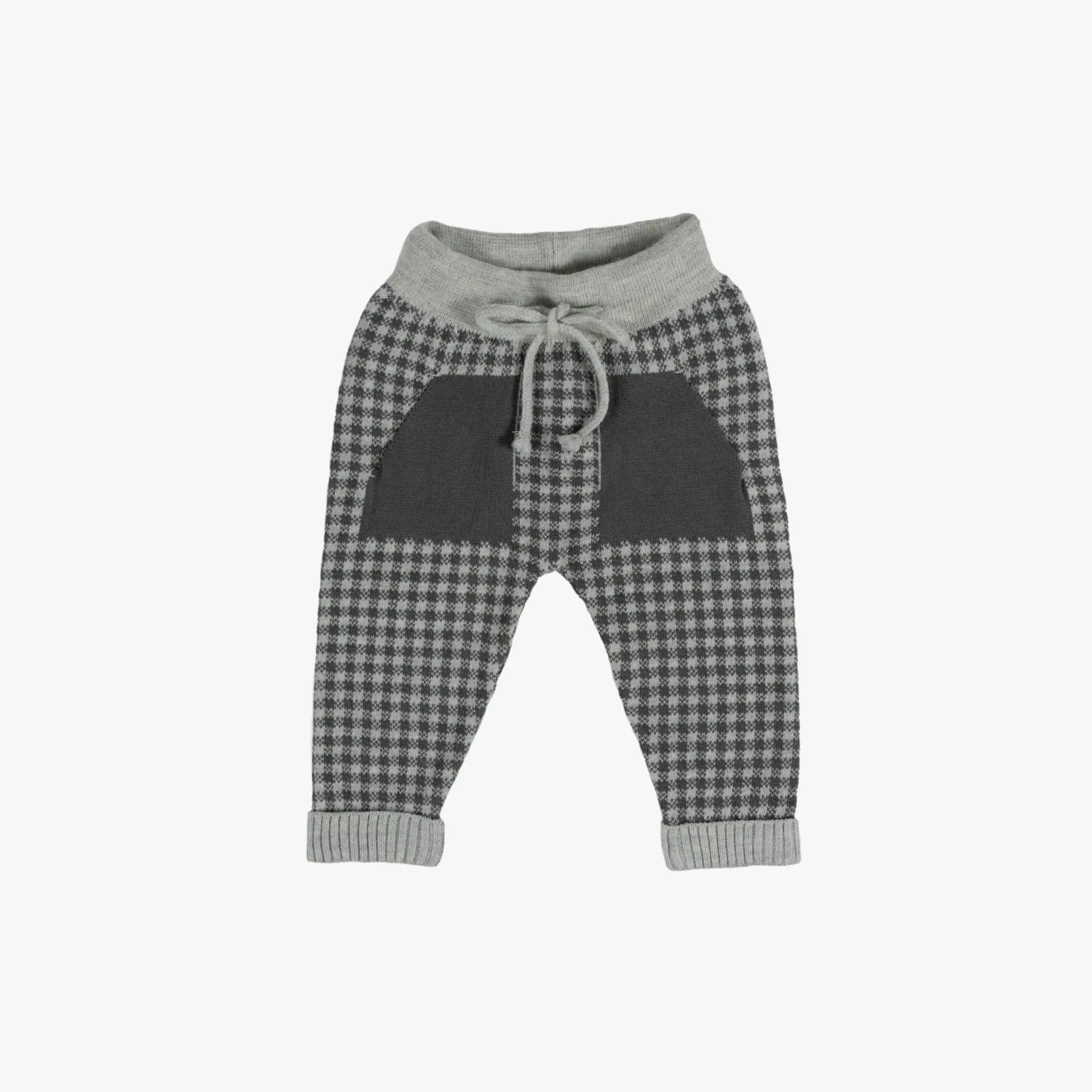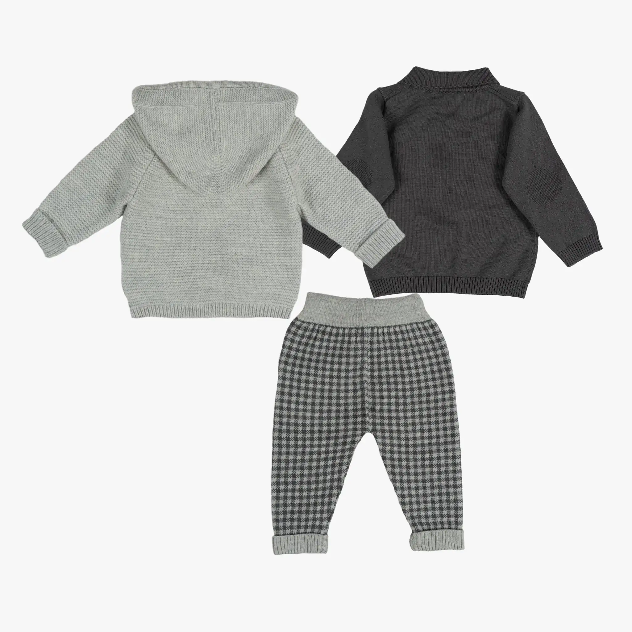 Super comfy 3 piece gray set for little boys by Leoking. The set is knitted in a beautifully soft and luxurious Merino wool blend with ribbed trims for extra coziness. The jacket features a hood for extra cover and front button fastening for functionality. There are 2 pouch pockets with a flap on the front, decorated with buttons, and 2 knitted braids on the side of the jacket for a special design. This comfy sweater has button fastenings, a pocket on the left side, and a special knitting design on the elbows area for style and function. Warm and cozy to the touch, these drawstring brown and gray gingham pattern pants have 2 styled solid pockets and turned-up ribbed cuffs.