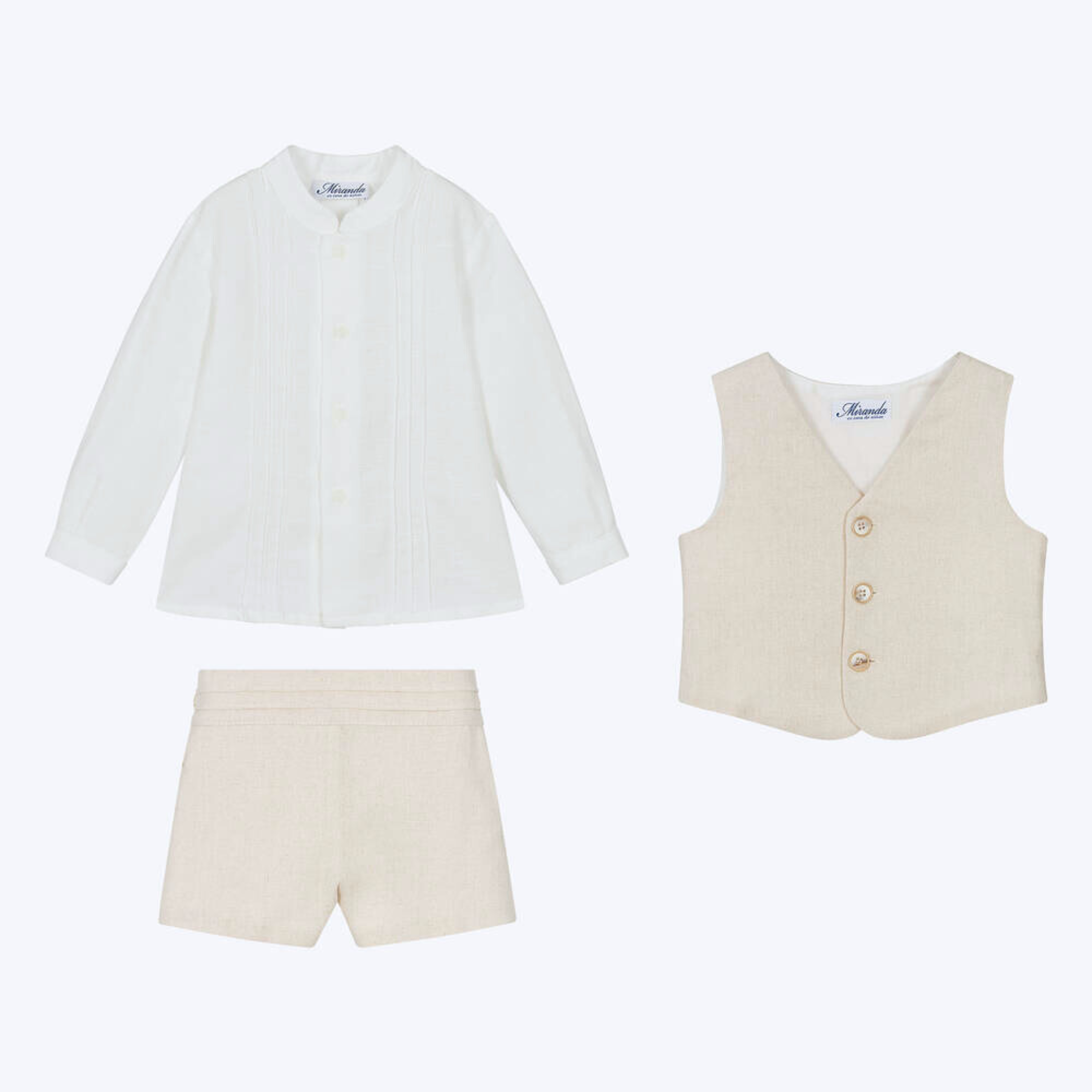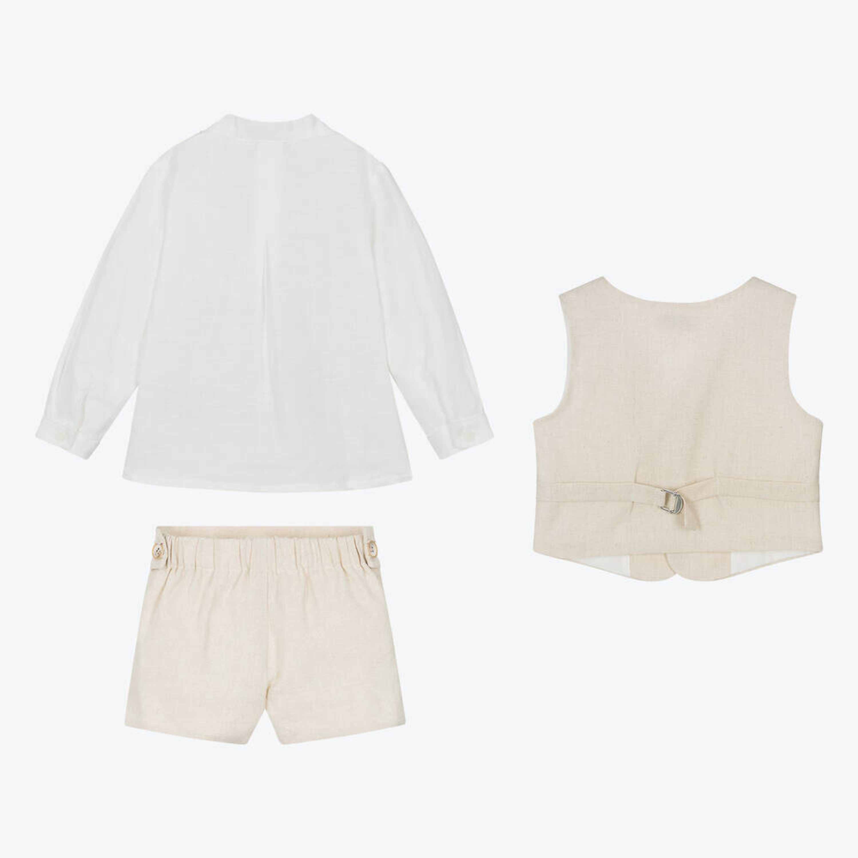 This set is made in a lightweight linen blend. The collarless ivory shirt fastens with front buttons and has an attached beige bow tie. The light beige shorts have a pleated panel across the front of the waist for timeless touch. They have side button fastenings and and a comfortable stretchy back waist. This beautiful set is completed with a beige waistcoat that shows 3 front buttons and an adjustable buckle in the back.