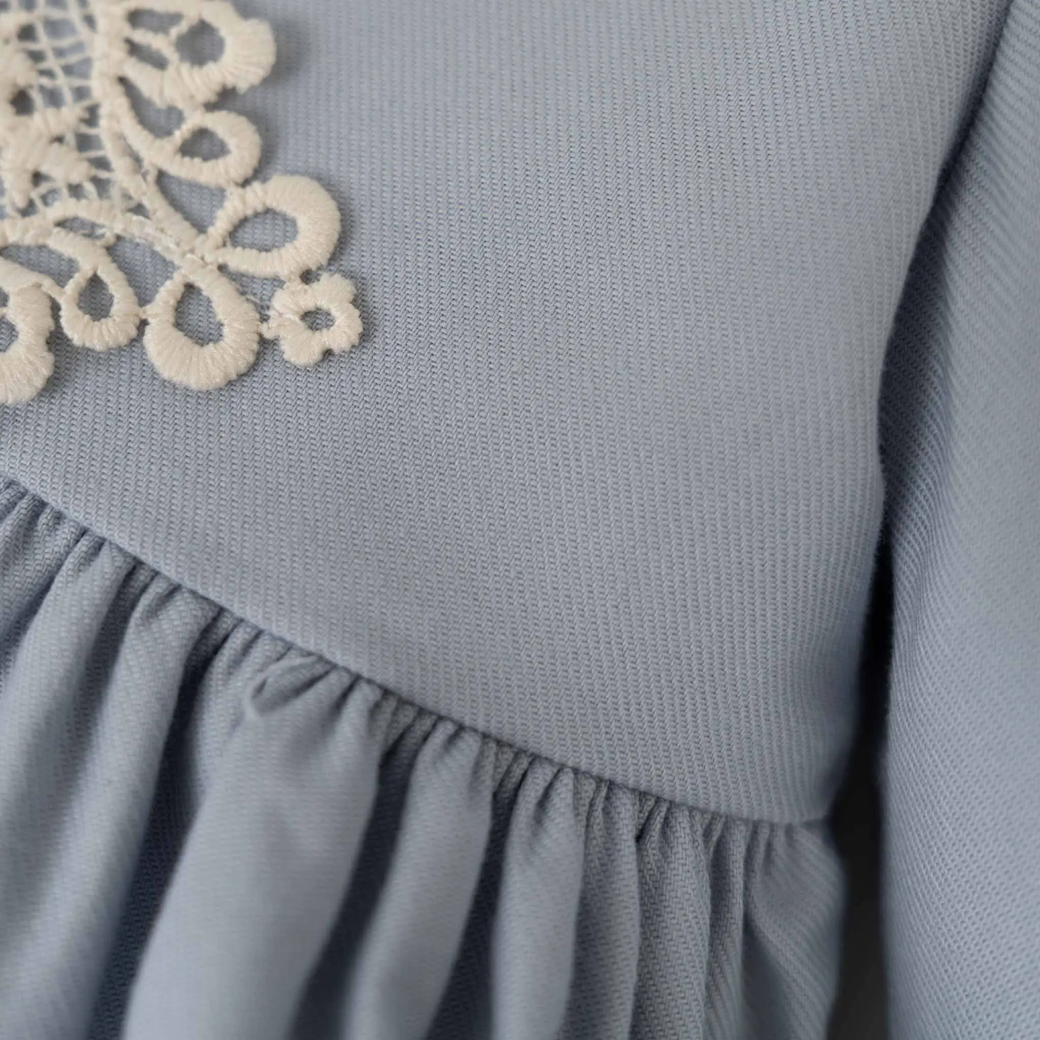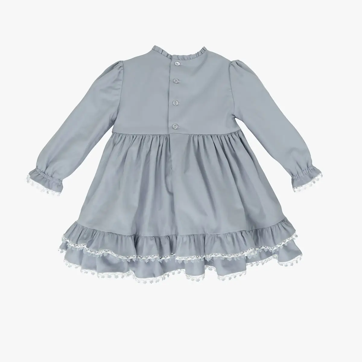 This fine pale blue dress by Miranda Brand is woven in a soft cotton twill. The ruffles around the cuffs and hem are trimmed with a delicate embroidered lace. There is elegant pintucking and ivory lace detailing on the bodice. The dress fastens with buttons at the back and it is fully lined for comfort.