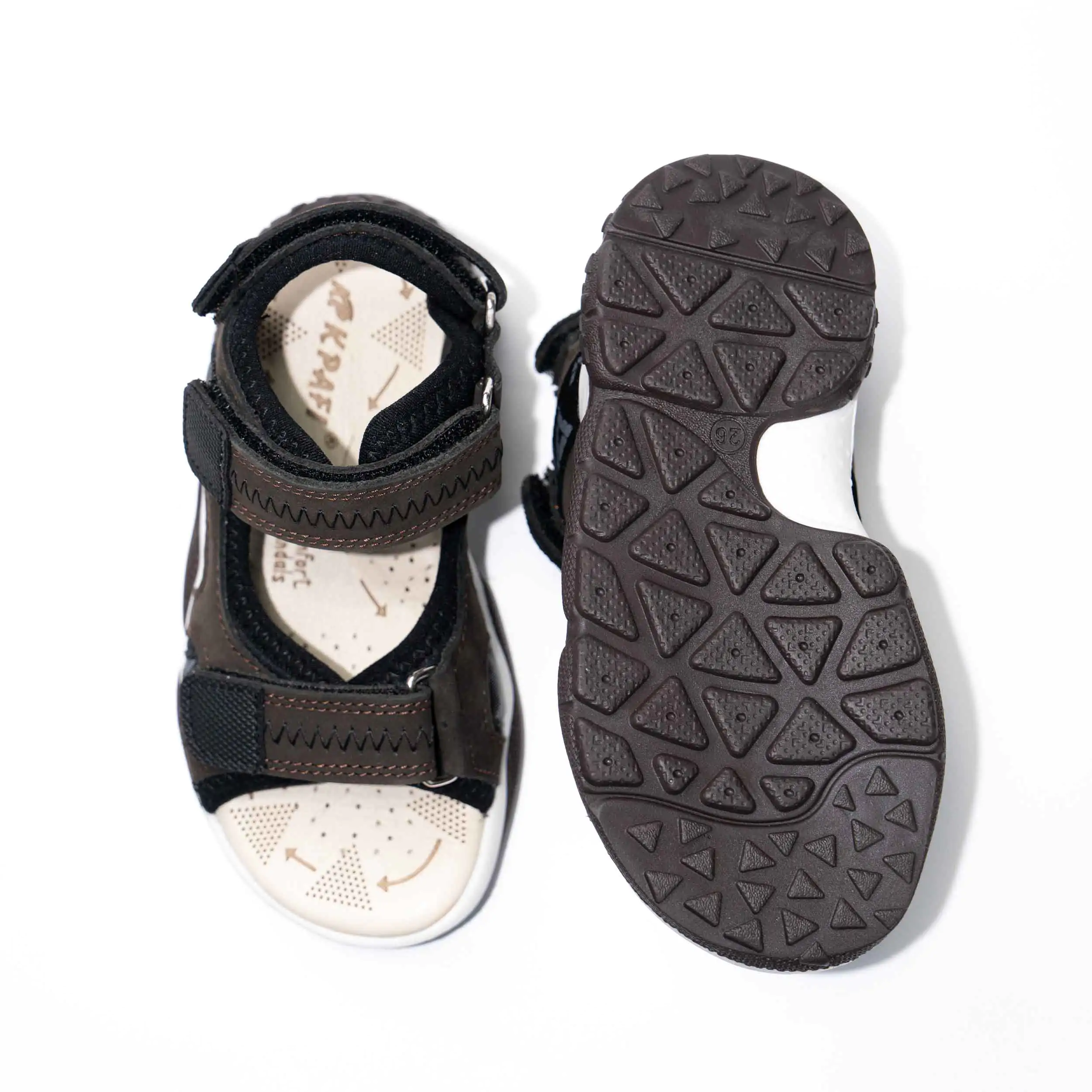 Brown leather orthopedic sandals for younger boys. These comfortable, these sandals are lined in soft leather, with velcro strap for an adjustable fit.