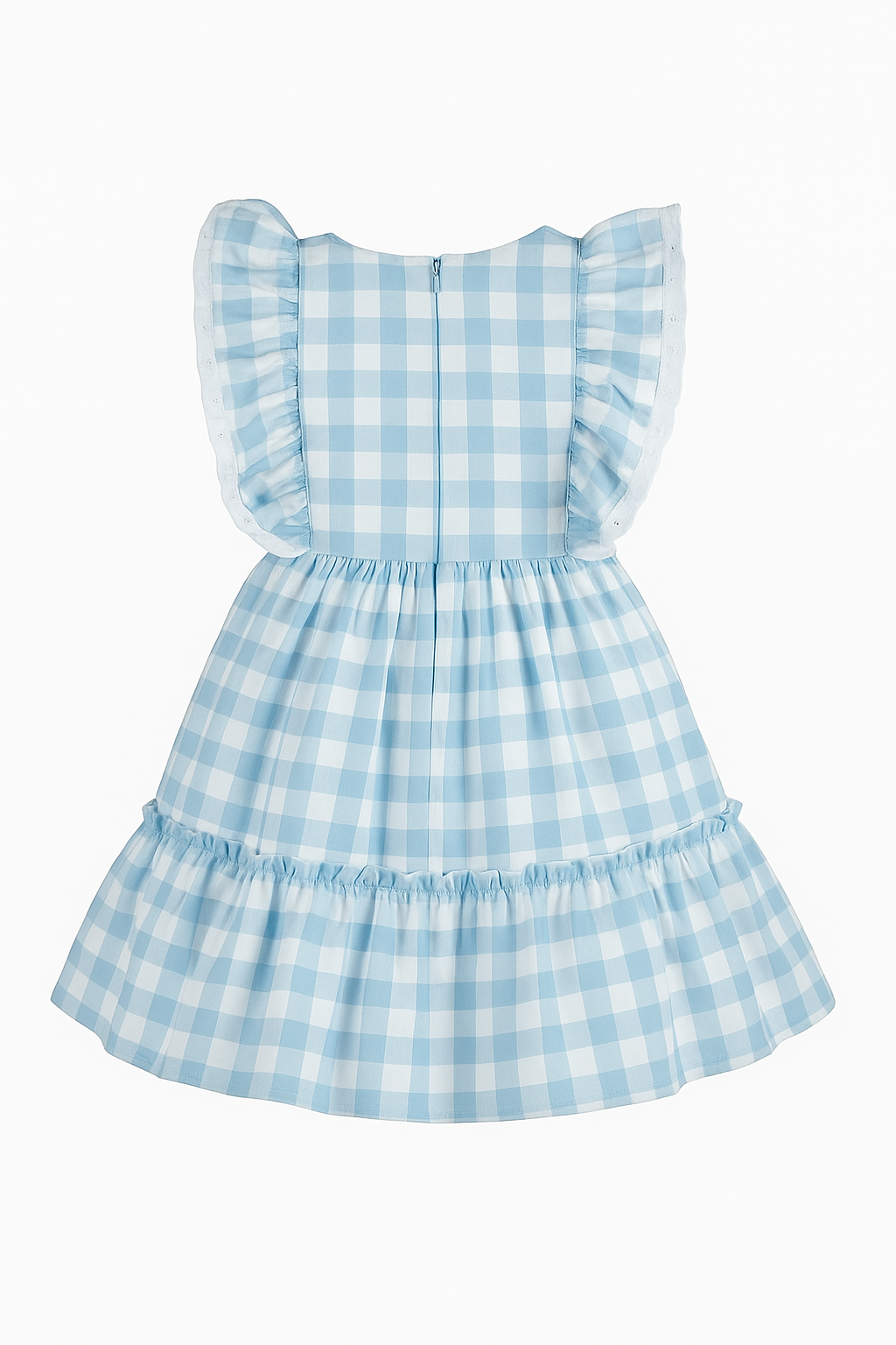 Beautiful light blue and white dress with capped ruffle sleeves, the pleated skirt has a lightweight lining for comfort, with a tulle trim on the hem for a structured finish. Neatly concealed on the back is an easy zip fastening. Comfortable and easy to wear.