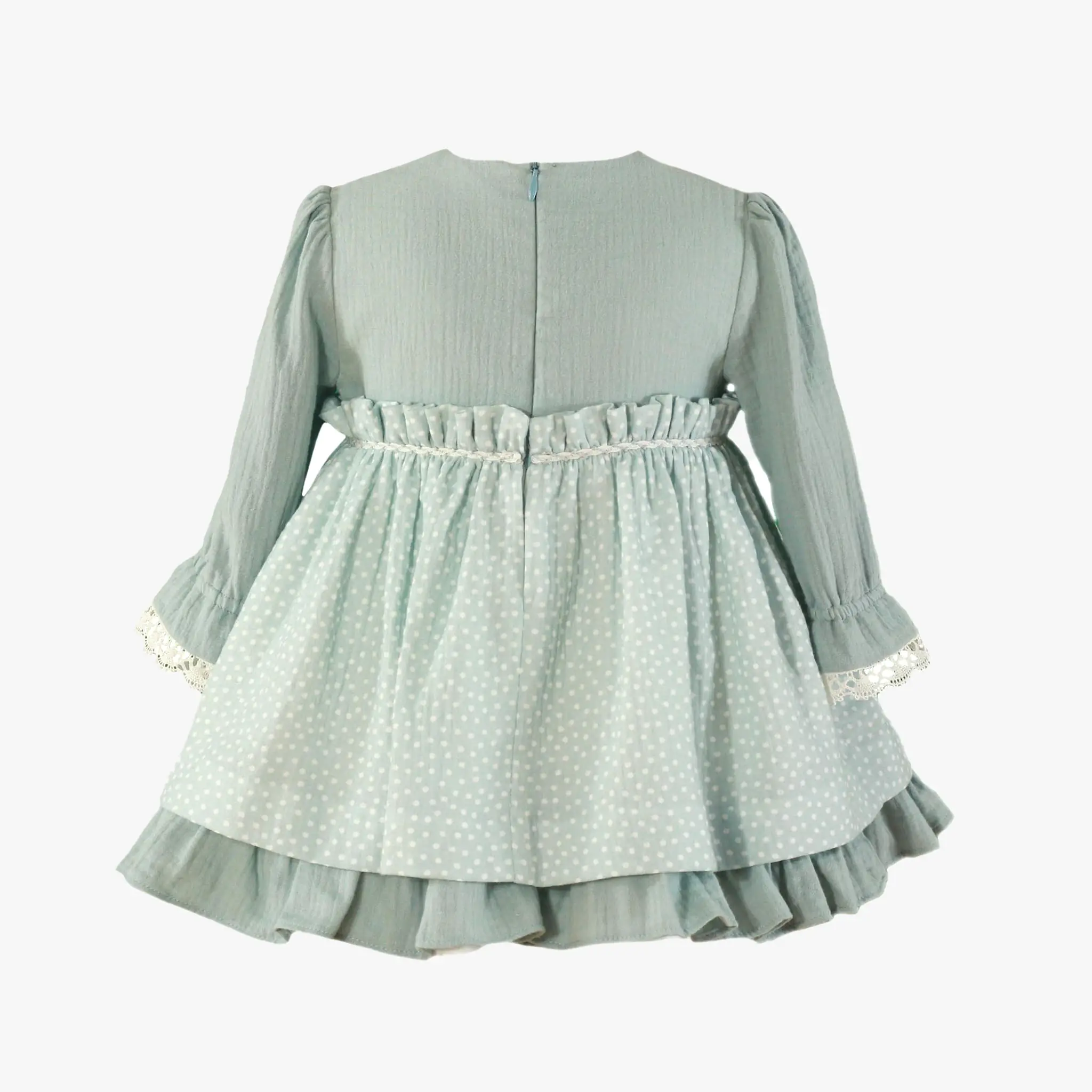 In a lovely shade of pale blue, this delightful dress for girls is by Miranda. The ruffled detail on the bodice and the top layer of the skirt is patterned in a pretty blue and white polka dot print. The center of the bodice is embellished with a delicately crocheted lace trim. The matching crocheted lace trim is found on the gently elasticated cuffs as well. It is fully lined for comfort and fastened with a discreetly concealed zipper on the back for a smart look.