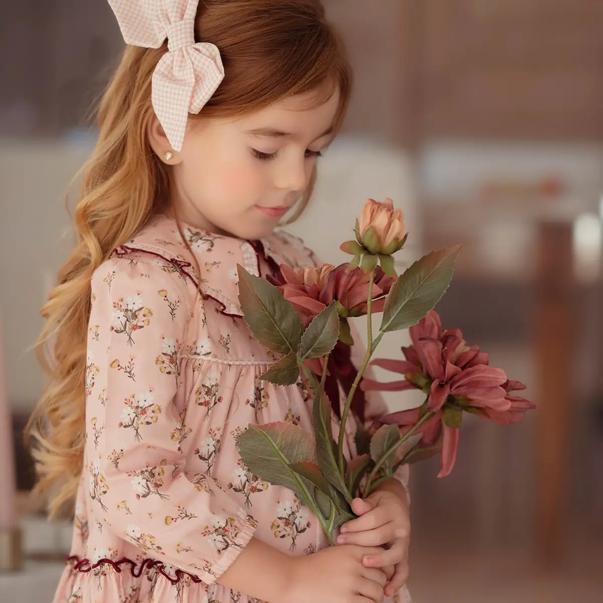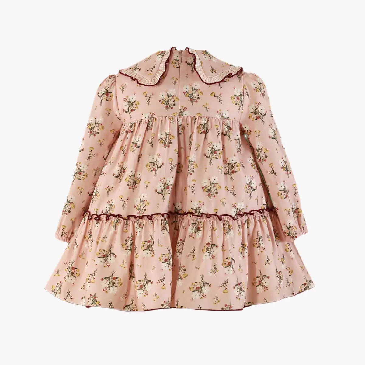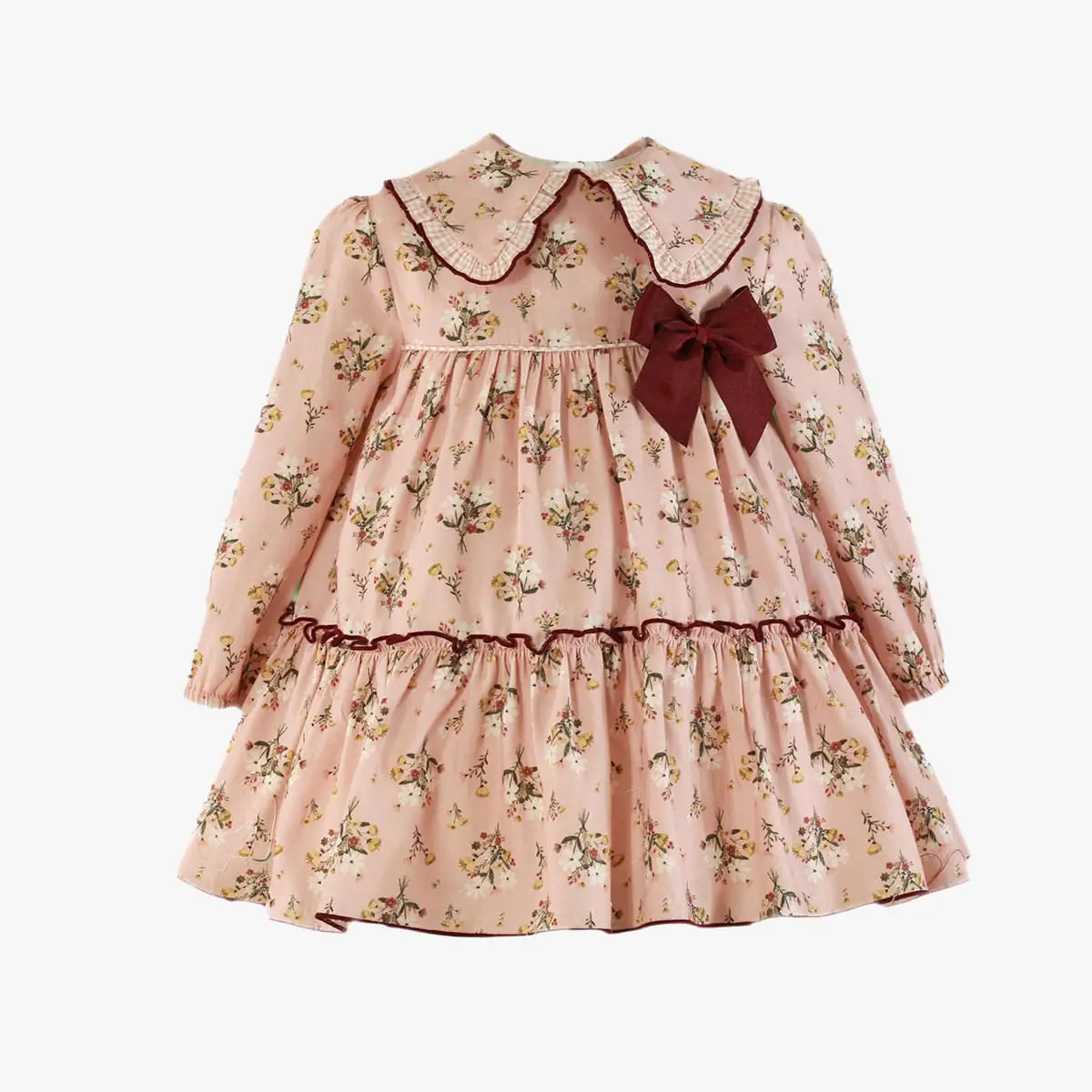 This delicate pink floral dress for girls by Spanish Brand Miranda is woven in a soft cotton blend. The gingham ruffle-trimmed collar is accentuated with a burgundy red border. A coordinating grosgrain bow sits beautifully on the bodice. This floral patterned dress has a lightweight voile and a concealed zip fastening on the back for a neat finishing touch.